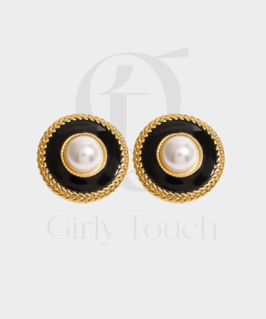 Affirmez votre style avec ces magnifiques boucles d’oreilles rondes au look vintage, alliant sophistication et originalité. Leur perle centrale nacrée est mise en valeur par un fond noir profond et un contour doré élégant, pour un effet chic...