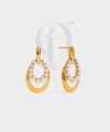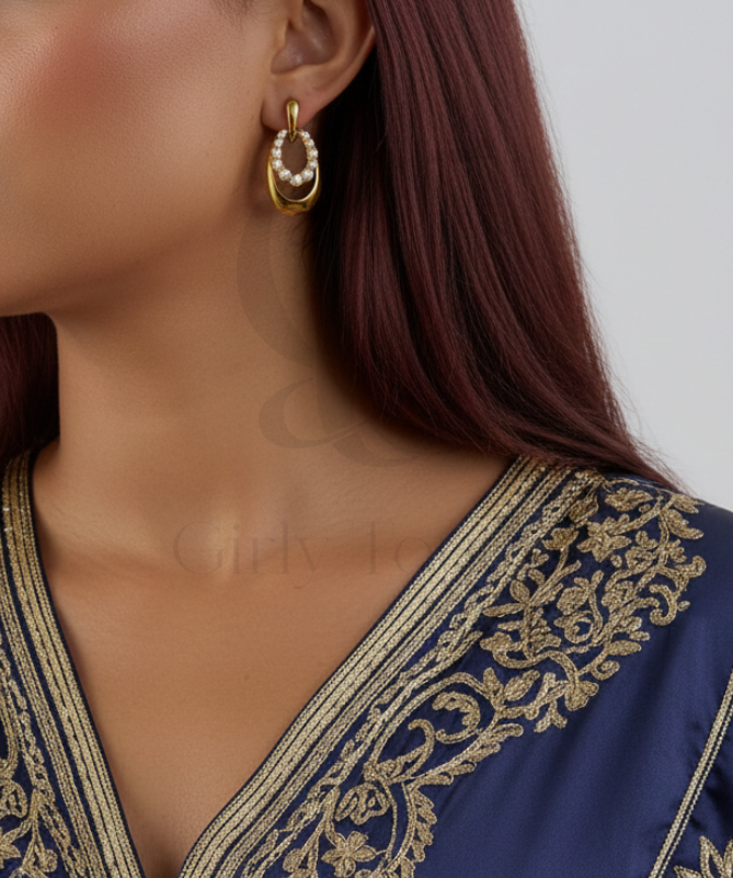 Sa forme ovale épurée entoure un délicat anneau serti de perles blanches nacrées, créant un jeu de lumière irrésistible qui illuminera votre visage à chaque mouvement.
