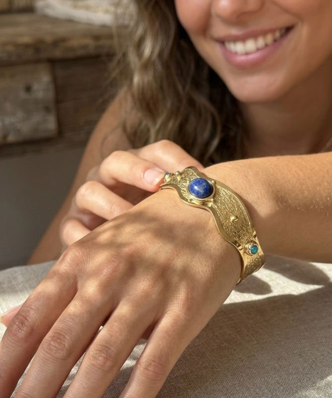 Sublimez votre poignet avec cette manchette sculptée, une pièce forte qui marie l’authenticité du style vintage à la modernité des matériaux durables. Son design ondulé et sa texture martelée captent la lumière pour un effet précieux et raffiné.