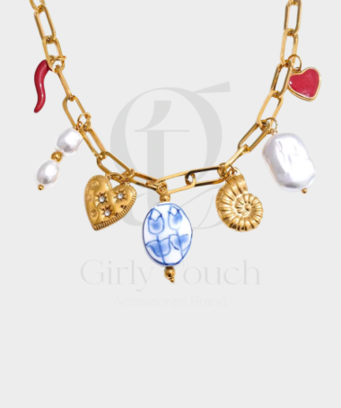 Un collier chaîne tendance avec des charms perle, coquillage, cœur et poivron rouge, idéal pour un look frais et féminin.